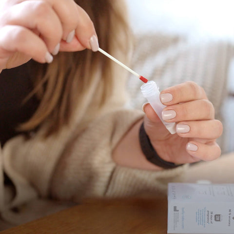 Drop the swab into the buffer tube and swirl it around 3-5 times to release the sample, and break the end of the swab into the tube. Wait 1 minute.
